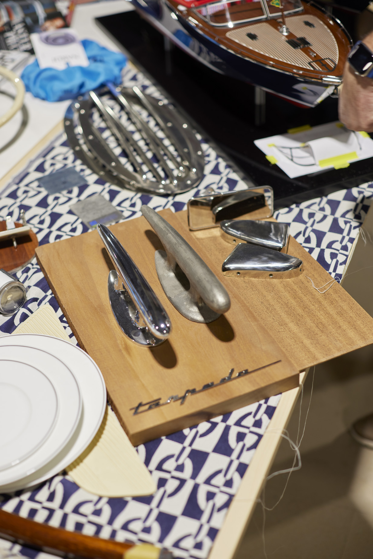 From the outset, each build responds to individual vision. Owners select from thirteen hull colors and ten interior color schemes, each dramatically altering character. These can be enhanced with two-tone combinations, seat piping, and diamond stitching. Past builds have featured fabrics from Loro Piana and Ralph Lauren, custom luggage sets, tailored picnic baskets, and materials matched precisely to owners' automobiles.